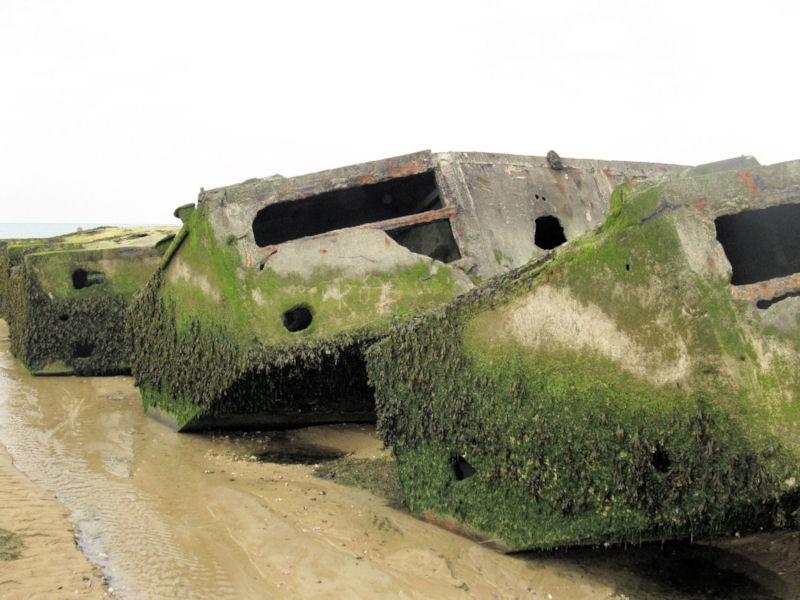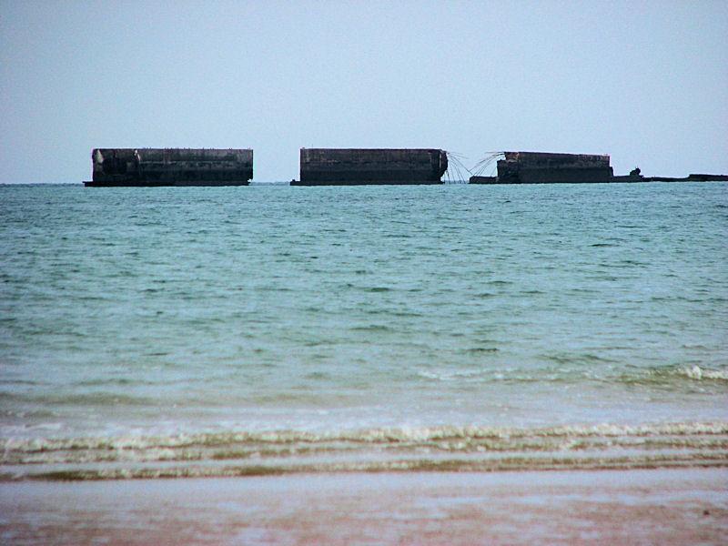 In Arromanches vindt u nog de stalen pontons die tijdens de invasie een drijvende kade vormden. Via drijvende bruggen was deze verbonden met het strand.